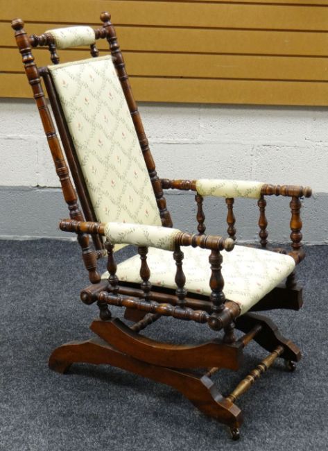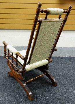 AN AMERICAN-STYLE SEMI-UPHOLSTERED ROCKING CHAIR of turned-wood form