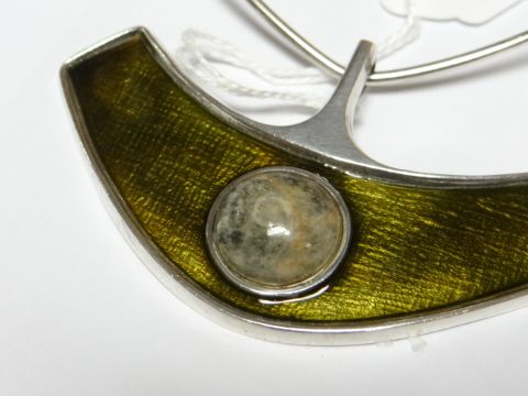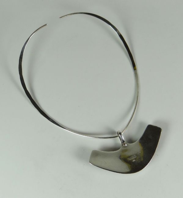 A NORWAY STERLING SILVER COLLAR NECKLACE & PENDANT by David Andersen, the curved enamel pendant with raised mineral button, 1.4ozs Provenance: Estate of Helen Zienkiewicz Deceased (1926-2016) late wife of Olgierd Cecil Zienkiewicz CBE FREng, FRS (1921 - 2009) acclaimed Polish-British mathematician & civil engineer https://en.wikipedia.org/wiki/Olgierd_ZienkiewiczThere is slight damage to the centre mineral button otherwise everything looks greatOn the back it says 925SNext line says Norway SterlingThen under that it says UNI