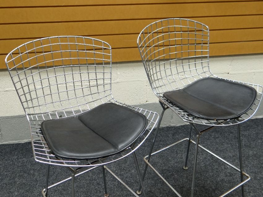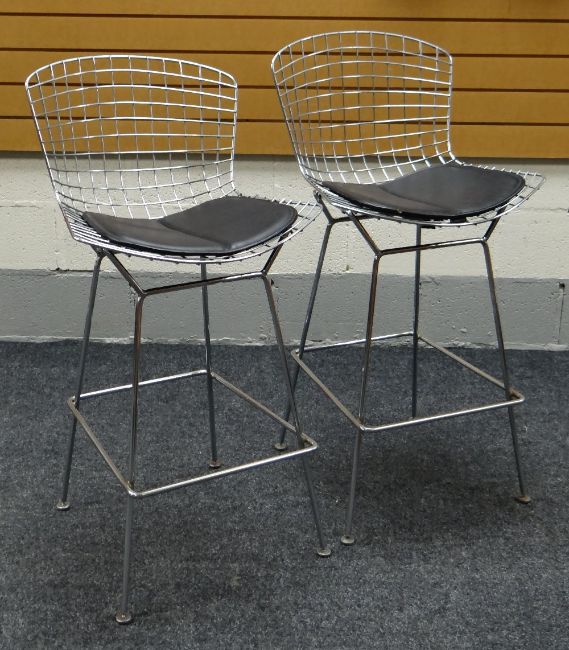 A PAIR OF CHROME WIRE WORK HIGH STOOLS in the style of Harry Bertoia, being of curved & shaped form on four corner supports, 102cms high