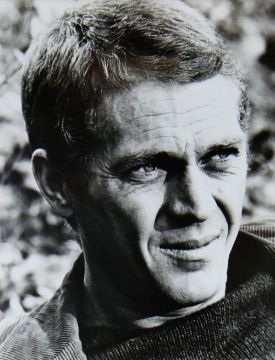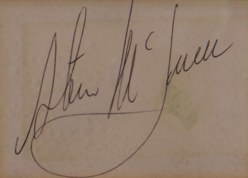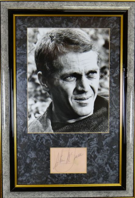 STEVE MCQUEEN AUTOGRAPH on autograph book page enclosed with a photographic print of the actor, framed, 25 x 19cms