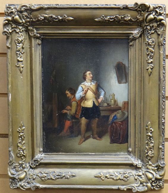 J G SCHULTZE oil on board - interior scene with seated & standing soldier, indistinctly signed, 27 x 20cms