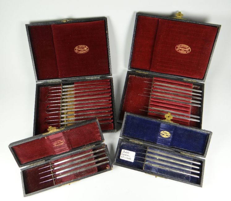 FOUR CASED SETS OF OPTHALMIC PRECISION INSTRUMENTS including set of four Pooley's iridotamy knives etc