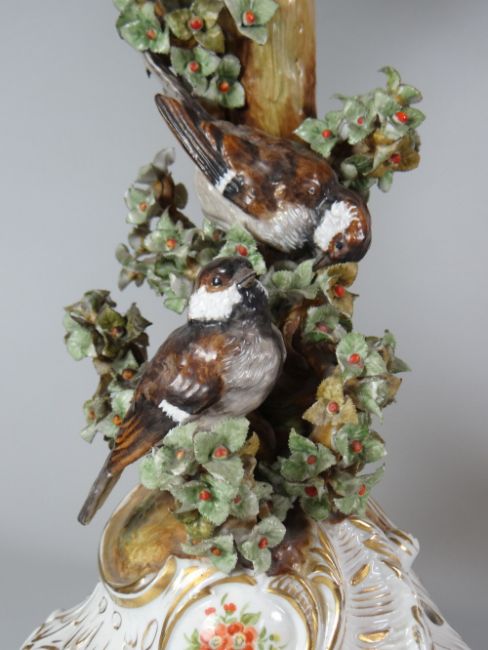 A PAIR OF NINETEENTH CENTURY SITZENDORF PORCELAIN TABLE CANDELABRA in the form of trees with two garden birds perched to each and on Rococo-style gilded & floral panelled bases, 50cms high