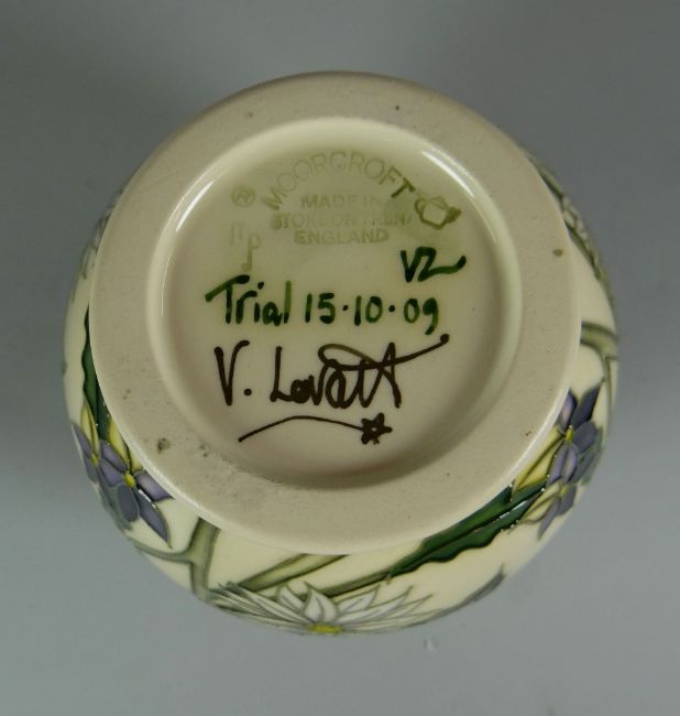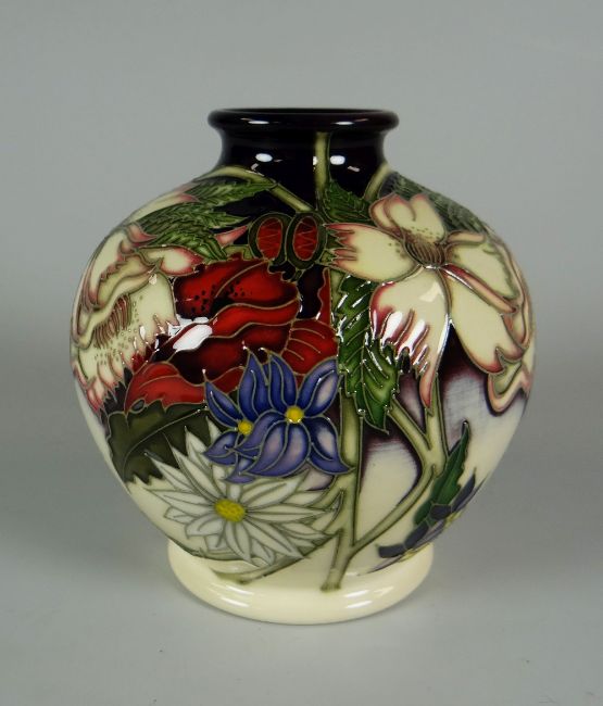 A 2009 MOORCROFT SQUAT NARROW NECK VASE in a trial for Ophelias Flowers pattern by V Lovatt, 12cms high
