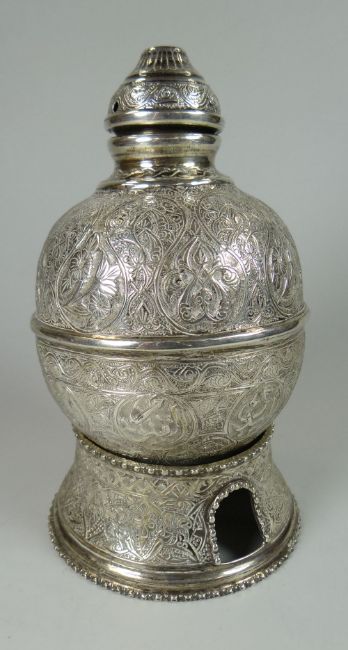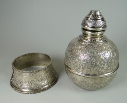 AN EGYPTIAN SILVER BEAN VESSEL & STAND profusely engraved with Islamic decoration, 13.9ozs
