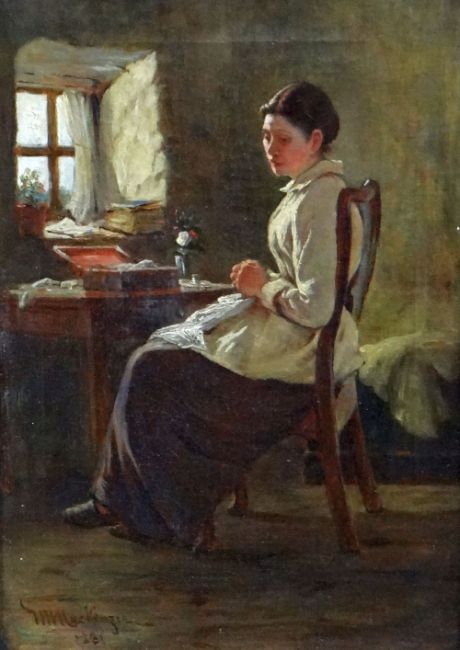 WILLIAM MURRAY MACKENZIE (fl. 1850-1908) oil on canvas - lady seated beside a window with sewing box, signed & dated 1881, 35 x 25cms
