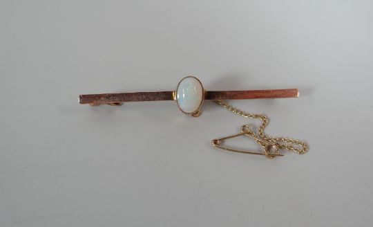 A SINGLE OPAL & 9CT GOLD BAR BROOCH with safety chain, 2.7gms