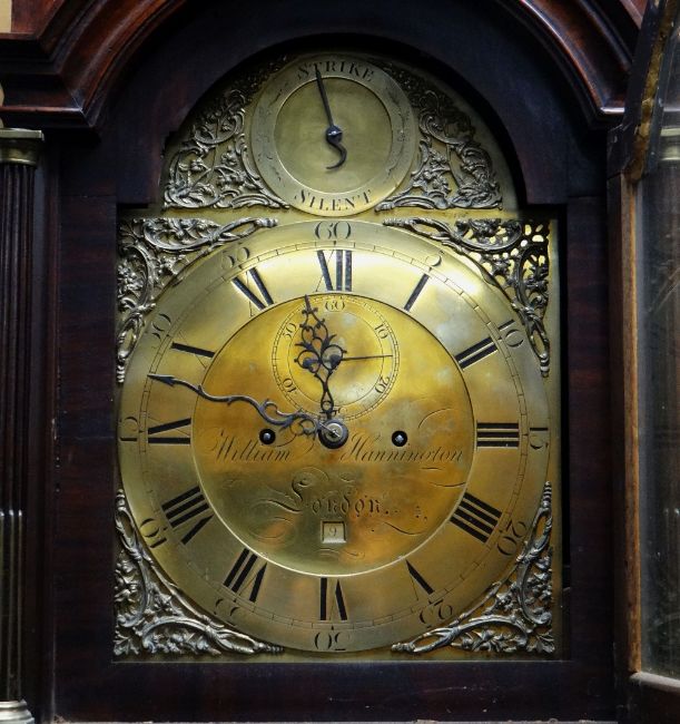 A LATE EIGHTEENTH CENTURY LONDON LONGCASE CLOCK mahogany encased and inscribed William Hannington of London & having an arched brass dial with Roman & Arabic numerals, strike/silent subsidiary dial to the arch, with eight-day movement striking on a bell & with inner subsidiary seconds dial all within a basket-top hood, 240cms high