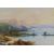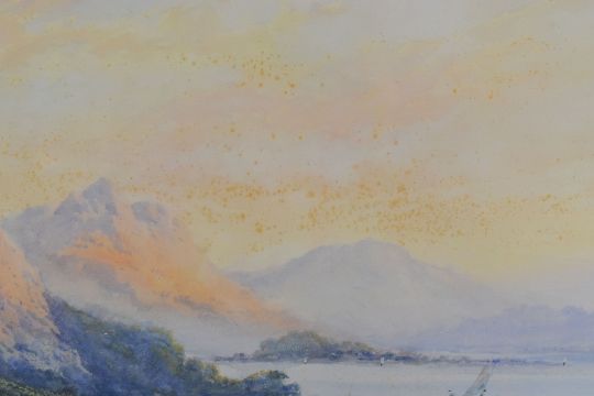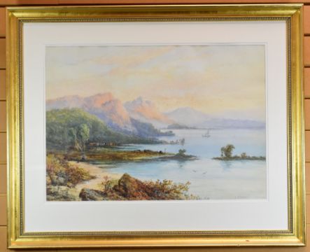 I WILSON watercolour - shoreline with figure, boats & mountain range, signed, 48 x 68cms