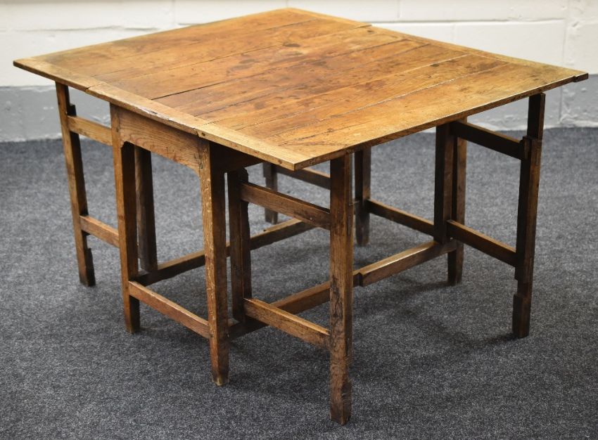 A NINETEENTH CENTURY JOINED OAK GATE LEG TABLE, the base with twin 'gates' at either side extending to 121cms long, 104cms wide
