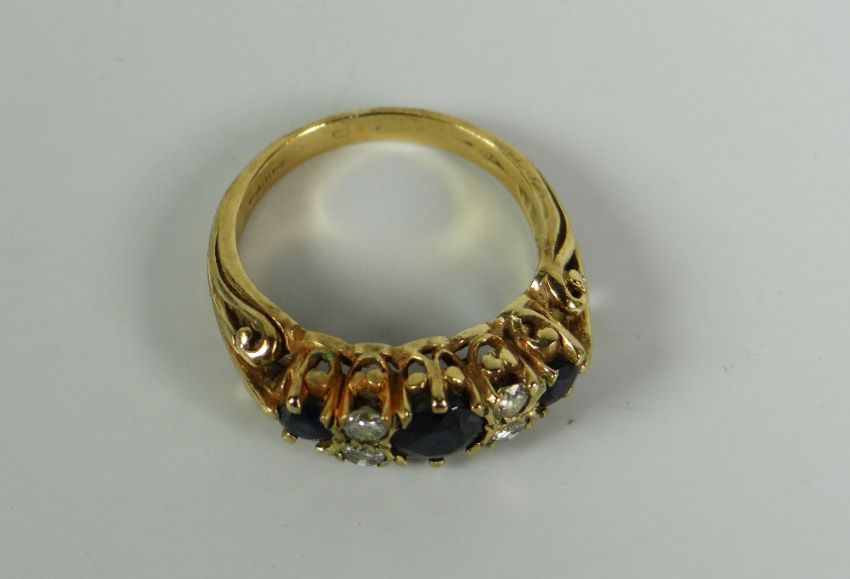 A 9CT YELLOW GOLD SET DIAMOND & SAPPHIRE RING, 4.2gms