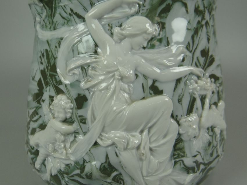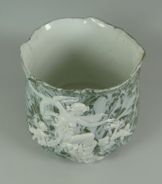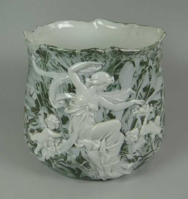 A CONTINENTAL PORCELAIN JARDINIERE with pat-sur-pat style decoration of maiden & cherubs within a mottled green glaze, unmarked, 17cms high