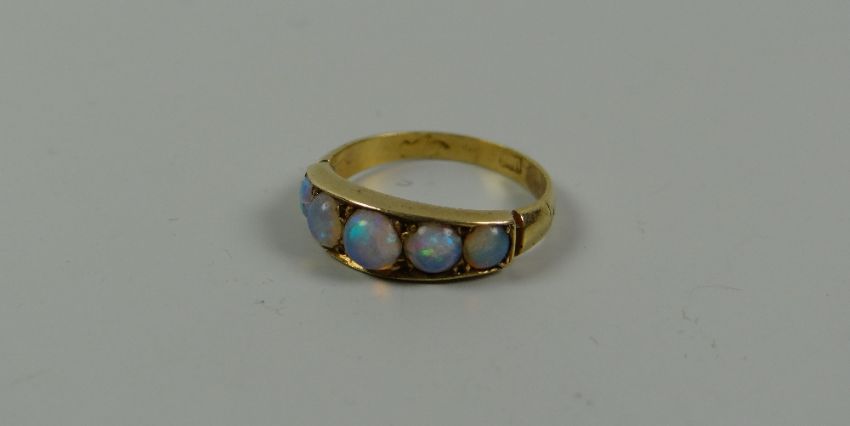 AN ANTIQUE GOLD RING set with five graduated opals, 2.6gms