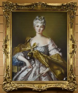 A NINETEENTH CENTURY FRENCH SCHOOL pastel on canvas - three quarters portrait of a lady in elaborate dress, holding a fan and pearls, her hair dressed up with tiara, unsigned, verso a Parisian art materials stamp and an inscription on an old label to the stretcher 'Princesse Waldburg', 79 x 62cms