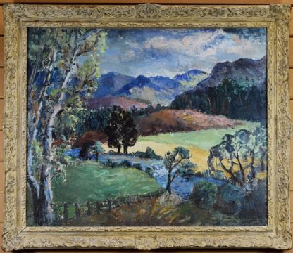 E OUGHTRED BUCHANAN oil on panel - landscape with trees, mountains & fields, with artist's address label verso, 62 x 75cms