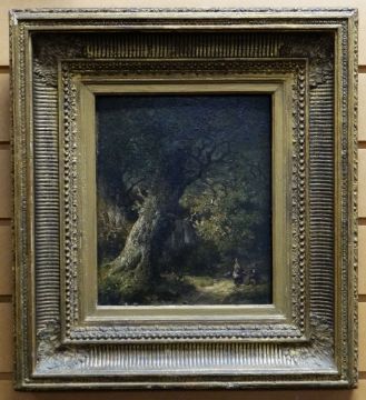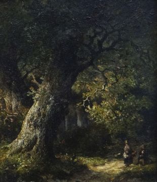 HENDRIK BAREND KOEKOEK (Dutch, 1849 - 1909) oil on panel - two figures on a path in a woodland, indistinctly signed bottom right, 26 x 22cms