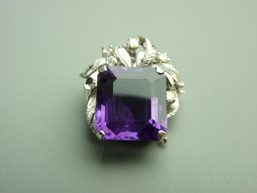 AN AMETHYST PENDANT having a strong purple emerald cut faceted stone, approximately 14.8 x 13mms and with five tiny diamonds set in the gold leaf surround, 8.2gms gross