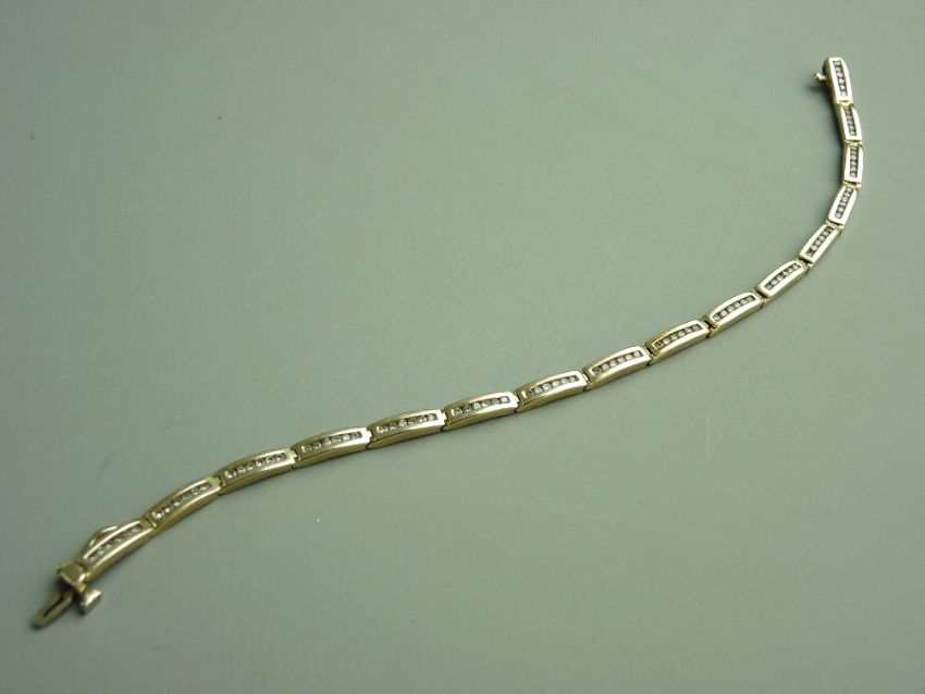 A NINE CARAT GOLD CHANEL SET DIAMOND BAR LINK BRACELET having sixteen links each with six tiny diamonds, total weight 1ct (stamped), 18cms long, 11.3gms gross