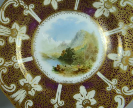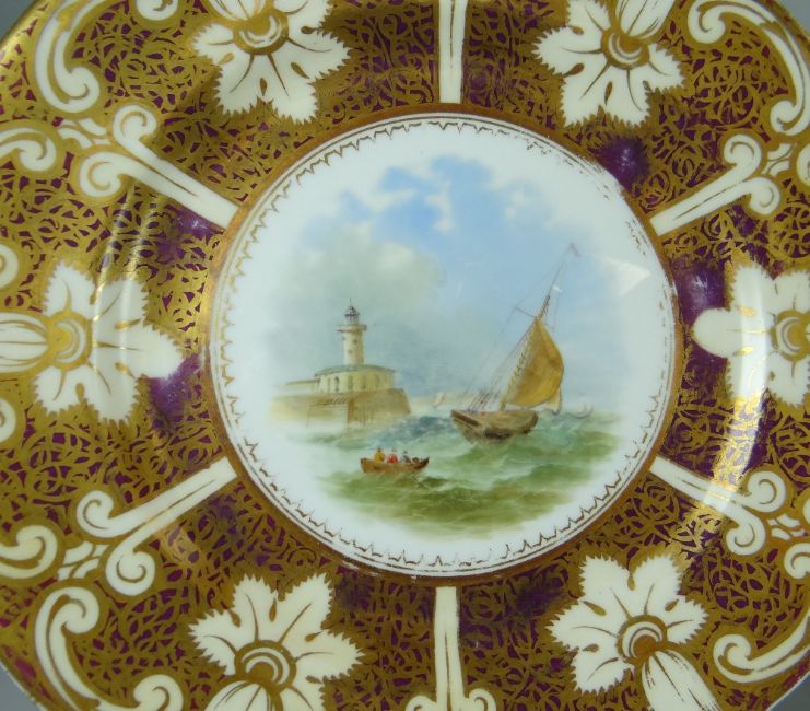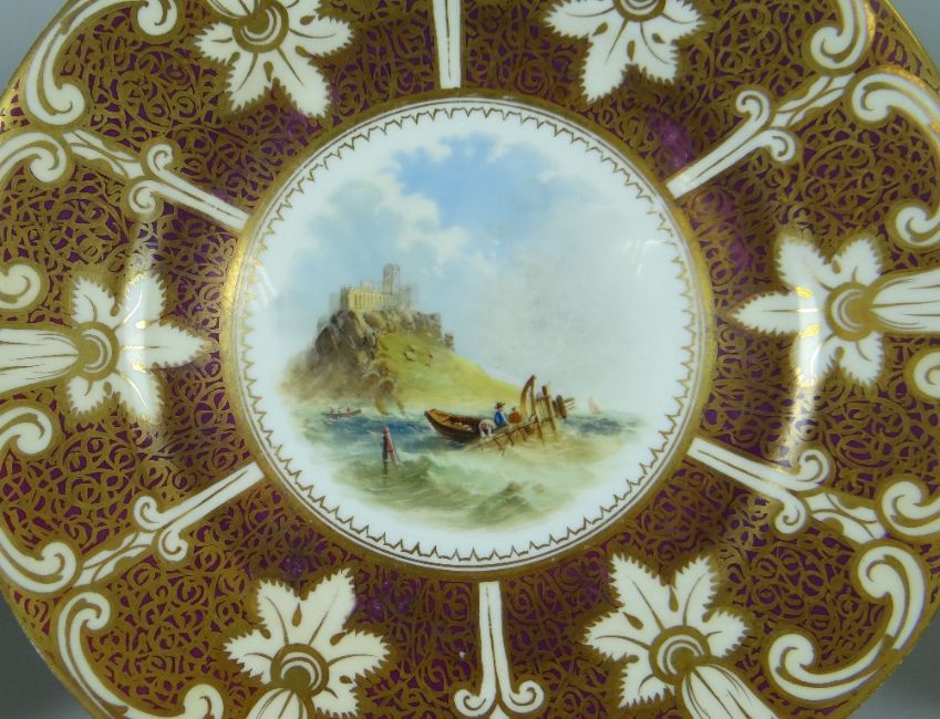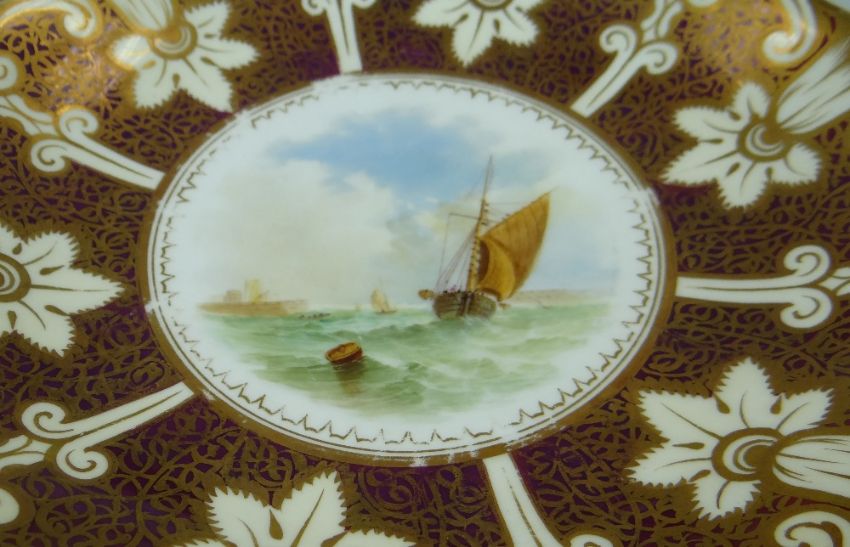 A FOUR-PIECE PART DESSERT SERVICE comprising three plates & fruit stand, each with painted interior scenes of landscape views or maritime depictions & profusely decorated gilded borders to a crimson ground