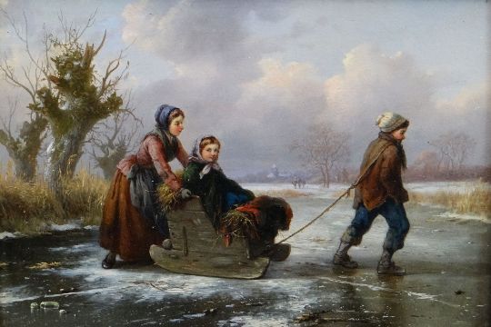 ALEXIS DE LEEUW (Belgian fl. 1848-1883) oil on board - winter scene with children pulling a wooden sleigh on ice, signed & dated 1865, partial label verso, 24 x 35cms