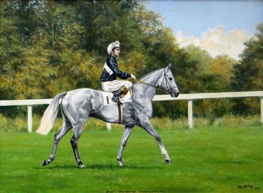 ROY MILLER oil on canvas - portrait of 'Bruni & rider Tony Murray', St Leger winners 1975, signed and dated 1976, 44 x 59cms