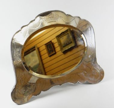 A LARGE SILVER FRAMED EASEL MIRROR with bevelled oval glass in a shaped frame, engraved with flower basket, garlands, song birds & musical instruments etc, 46 x 37cms