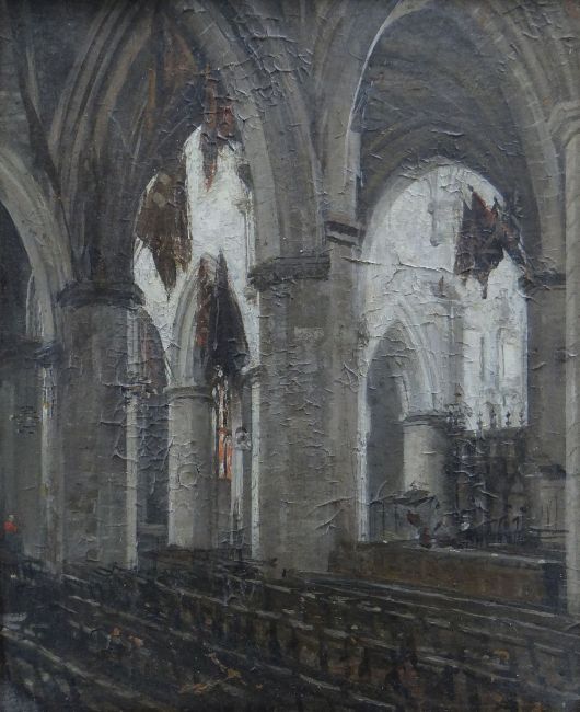 GEORGE OGILVY REID (1851-1928) oil on board - interior of a cathedral with figure, entitled verso 'St Giles Cathedral, Edinburgh', signed, 40 x 33cms