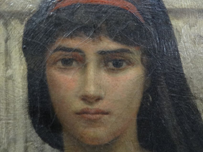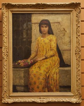 WALTER CHARLES HORSLEY (1855-1921) oil on canvas - full portrait of a young Middle Eastern girl in a yellow floral gown seated with basket of roses beside an Islamic building, signed & dated 1887, 60 x 43cms