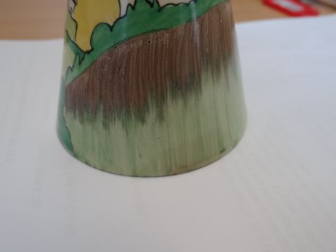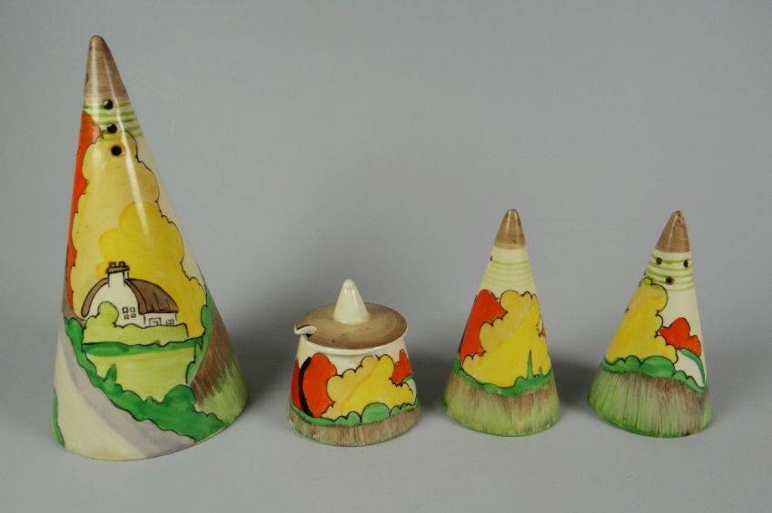 A CLARICE CLIFF FOUR-PIECE TABLE SET comprising castor, mustard pot and salt & peppers, each decorated with matching design of landscape & trees, the castor including bridge & cottageThere is a ‘thumbnail’ sized stain to the base of the caster.