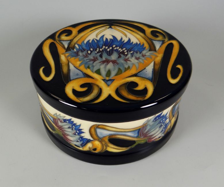 A 2012 MOORCROFT LIMITED EDITION (83/150) LIDDED BOWL in the Cornflower Cavalade pattern, signed V Lovett, 16cms diam