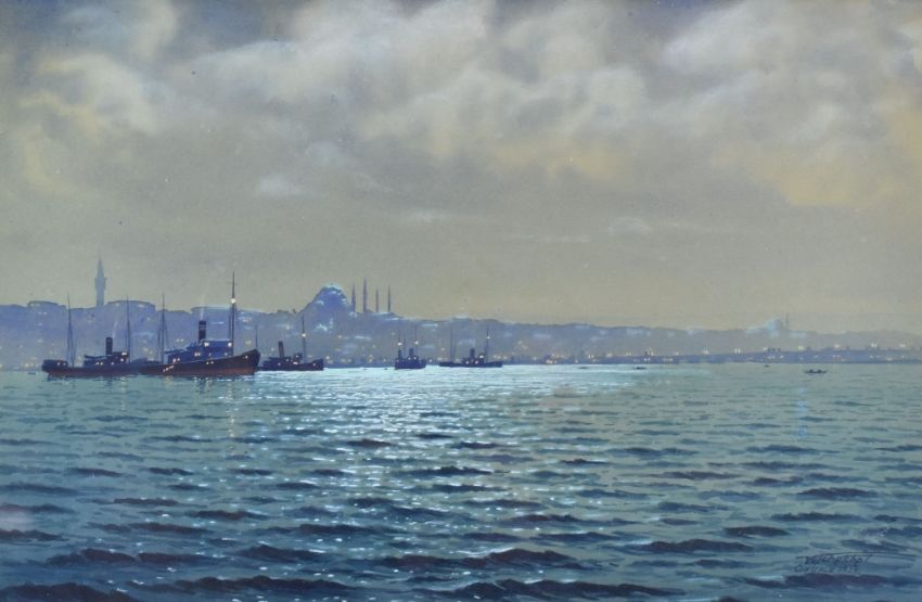 CONTINENTAL SCHOOL / CHETCHEL watercolour -the Bosphorus at night with vessels and city lights, entitled 'Constantinople 1923', indistinctly signed, 33 x 49cms