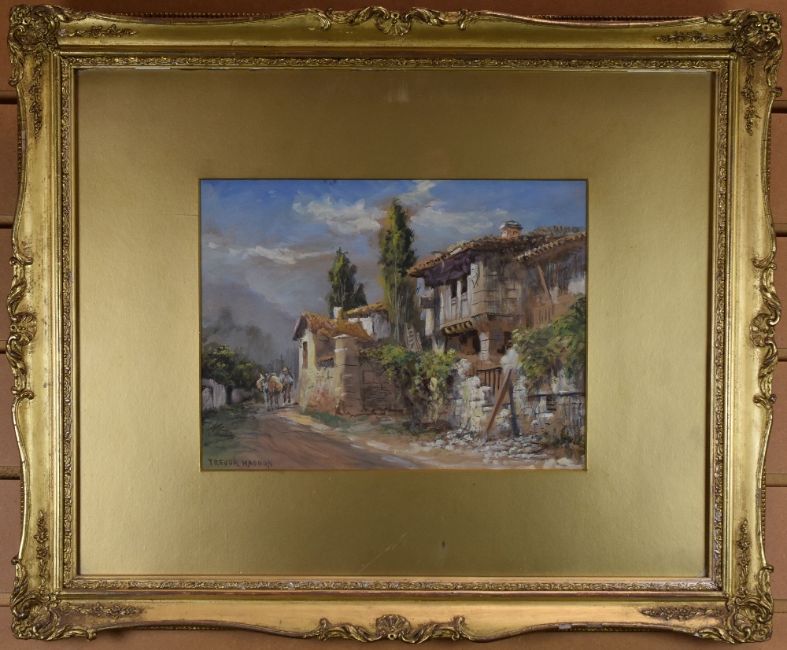 TREVOR HADDON watercolour - Continental scene with ramshackle villa, mule & figure, entitled verso 'Andalasia', signed, 22 x 30cms