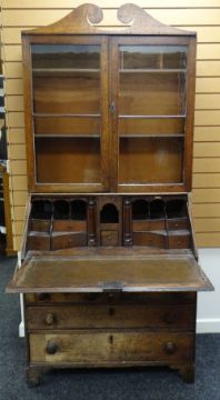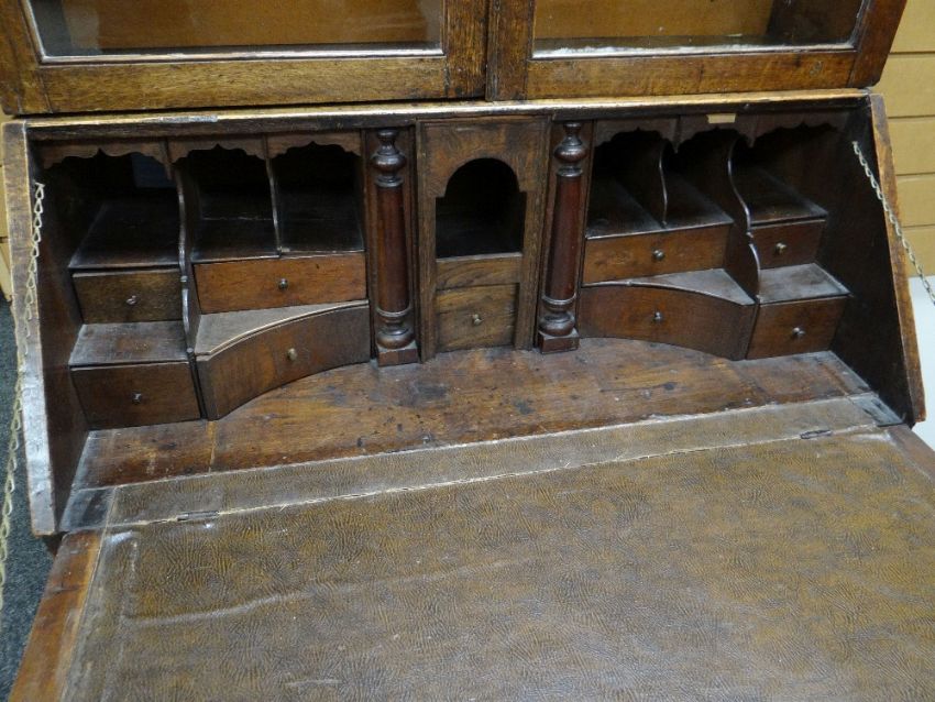 AN EARLY NINETEENTH CENTURY OAK BUREAU BOOKCASE having a two door glazed top with sloped front hinging to reveal an arrangement of drawers and pigeonholes over an arrangement of seven drawers, all on bracket feet, 210 cms high, 95cms wide