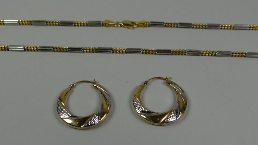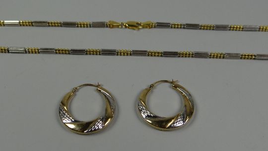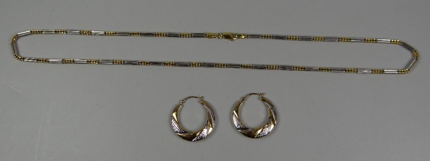 A TWO-TONE 18k GOLD NECKLACE, 13gms, together with a pair of 9ct two-tone gold hoop earrings, 1.4gms