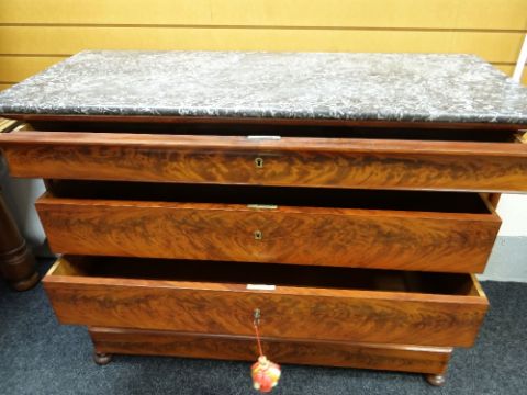 A FRENCH MAHOGANY & MARBLE COMMODE CHEST composed of four flush drawers over small bun feet with veined grey marble top, 130cms wideIt is in great condition, slight surface scratches to the marble top, nothing major.It is French ‘restoration period’ ‘Cuban Flame’ c1835