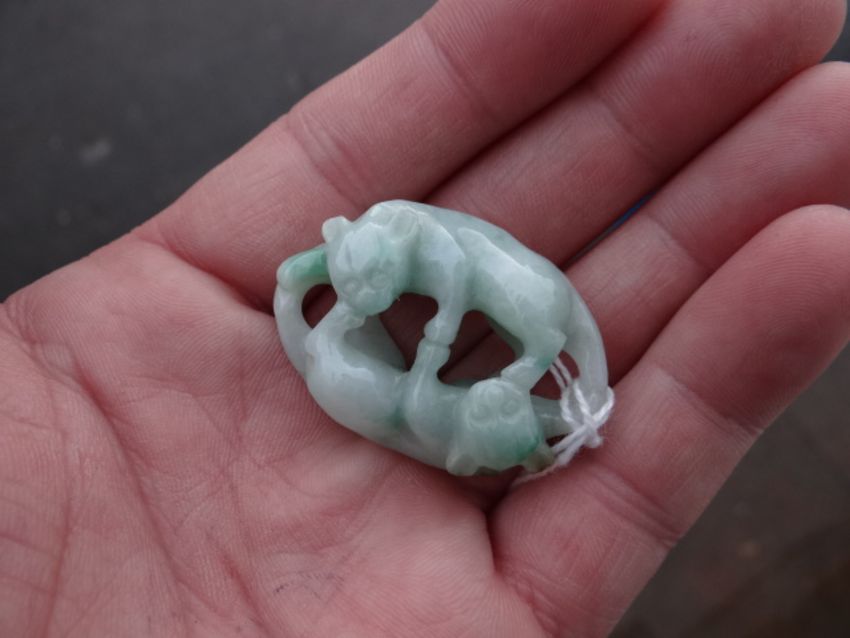A CHINESE CARVED SPINACH JADE TOGGLE in the form of two fighting lions in opposition, 4cms long
