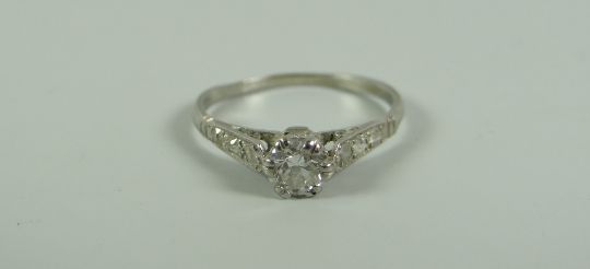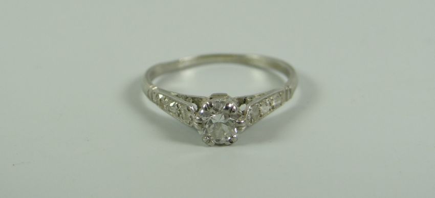 AN ANTIQUE DIAMOND RING with round cut diamond & small diamonds to the shoulders set in white metal