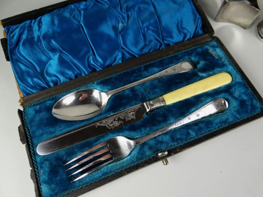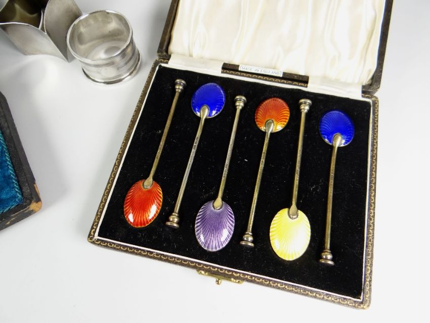 A PARCEL OF FLATWARE comprising a cased set of six silver and enamel coffee spoons, two silver napkin rings, and a James Dixon & Son EPNS travelling cutlery set