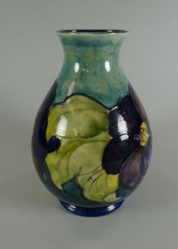 A MOORCROFT LIGHT & DEEP BLUE GROUND TUBE-LINED FLORAL VASE of baluster form with narrow slightly flared neck, 19cms high