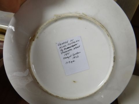 A NINETEENTH CENTURY FLORAL PAINTED PART TEA-SET decorated with floral studies within gilded borders to a pink reserveIn total there are three saucers, four teacups, a teapot and one plate. The teapot has a chipped spout and there is lots of wear to the gilding and one teacup handle has been restored.There is a label on the plate that reads George IV Kings Pattern, Jonathan Hayne 1826.