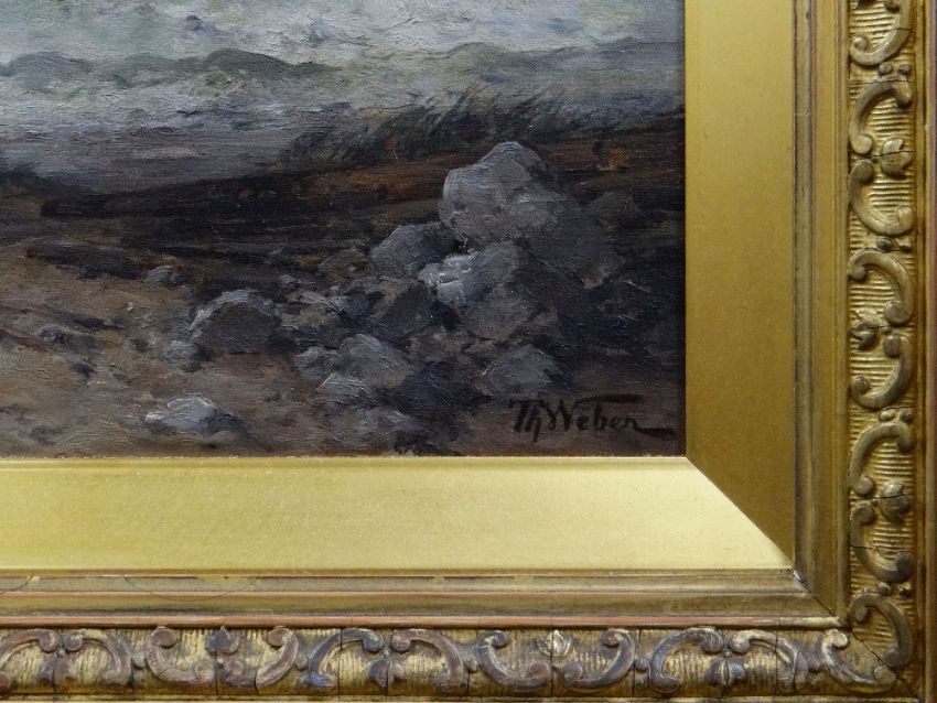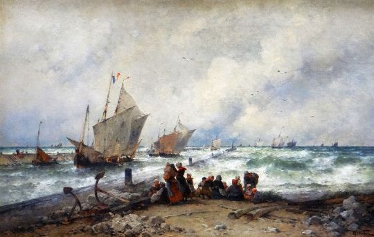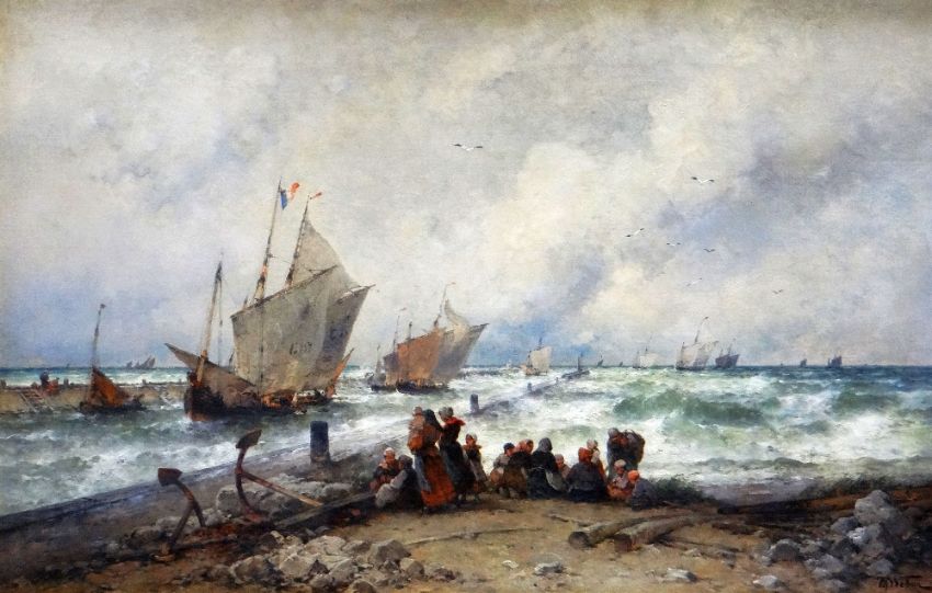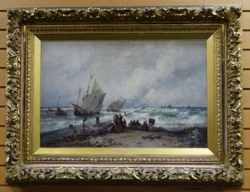 THEODOR ALEXANDER WEBER (German, 1838-1907) oil on canvas - superior maritime scene with French sailing vessels & numerous fishing folk figures huddled on the coastline, entitled verso 'High Tide at Gravelines', signed, 54 x 84cms (in a good Rococo-style gilded frame & mount)