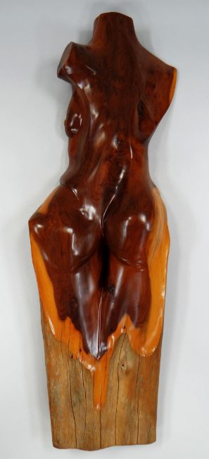 JOHN M TAULBUT wood carving - torso, signed & with artist's address label verso, 97cms high