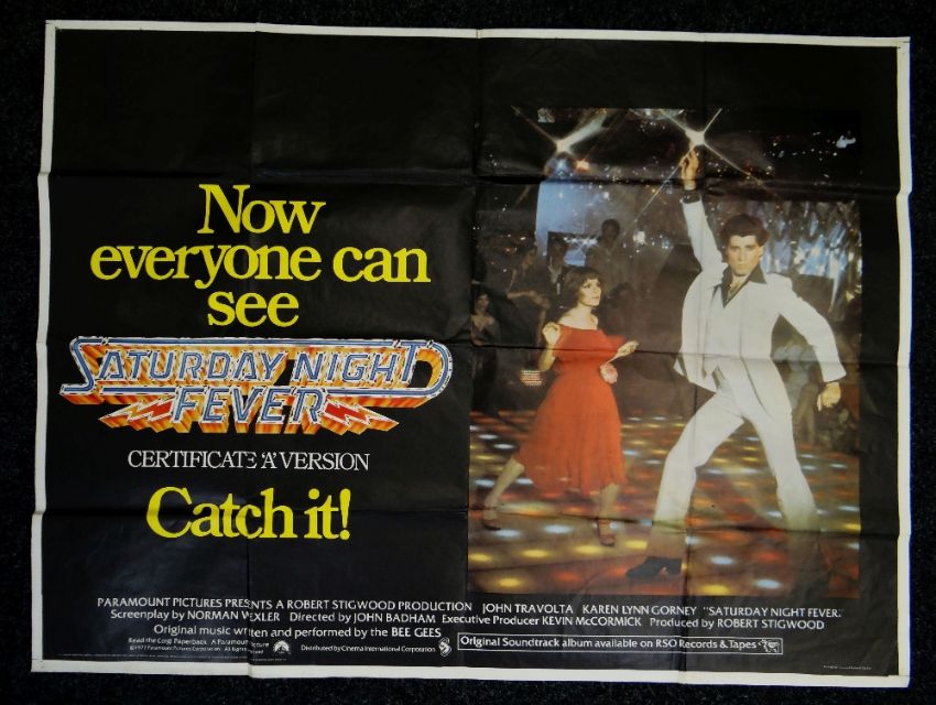 SATURDAY NIGHT FEVER original UK cinema poster from 1977, folded, pin holes in corners otherwise excellent condition, together with a second 'certificate A' version, 76 x 101cms (30" x 40" UK quad size)