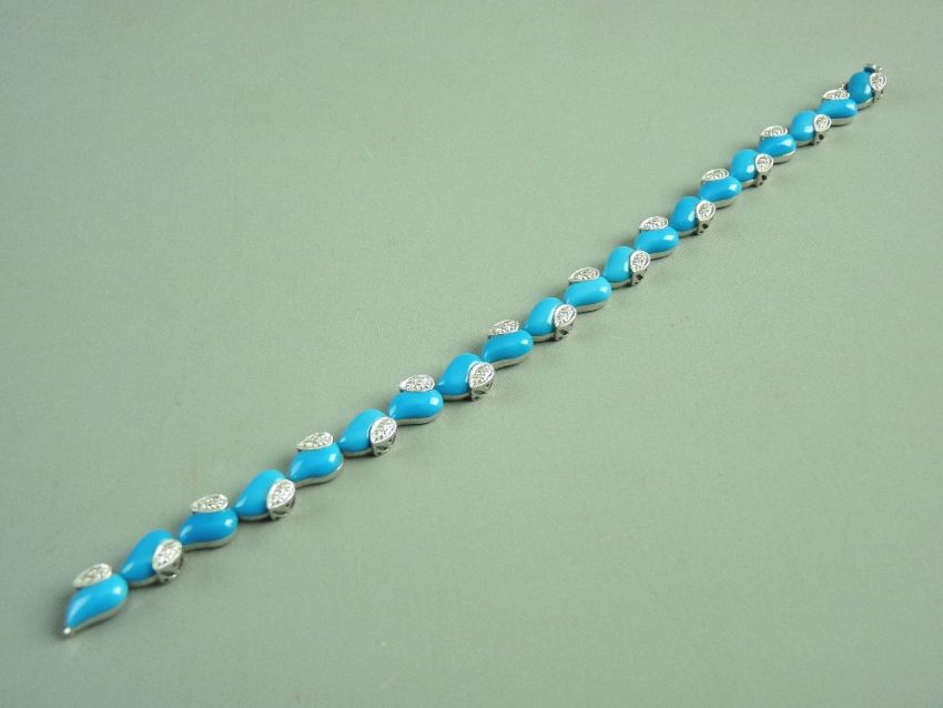 AN EIGHTEEN CARAT WHITE GOLD DIAMOND SET TURQUOISE COLOURED HEART LINK BRACELET of twenty dyed howlites and approximately forty tiny diamonds, total 16.3gms