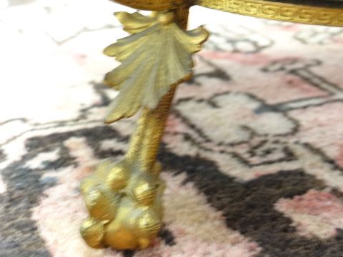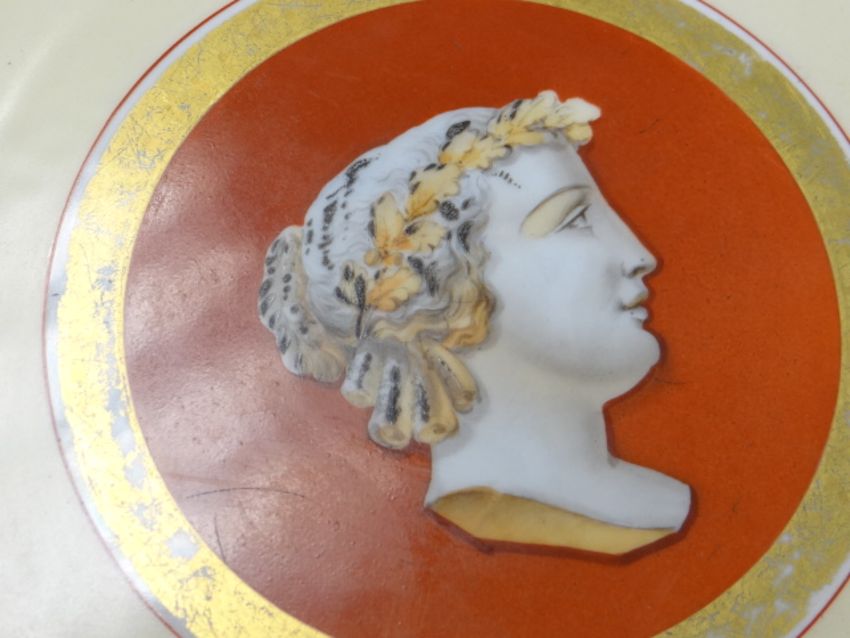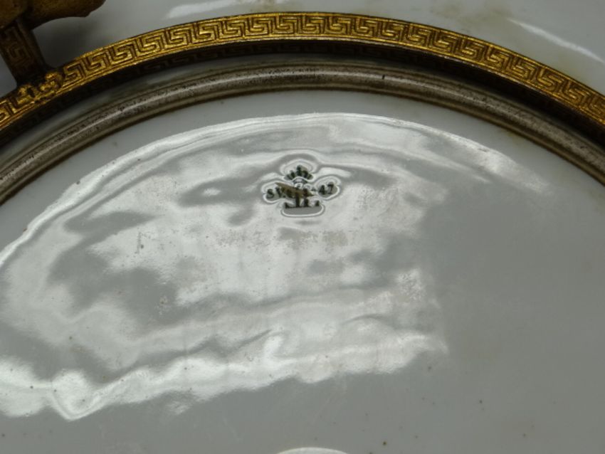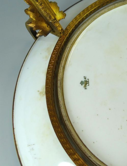 A CONTINENTAL PORCELAIN COMPORT on a gilt metal stand, the interior of the porcelain decorated with a Romanesque portrait & with Grecian key border, the stand with ball & claw raised supports & Grecian key decoration to the handles & mounted supports, 30cms diamIts generally in good shape there is general wear, ie surface scratches and gilt wear, there is no damage