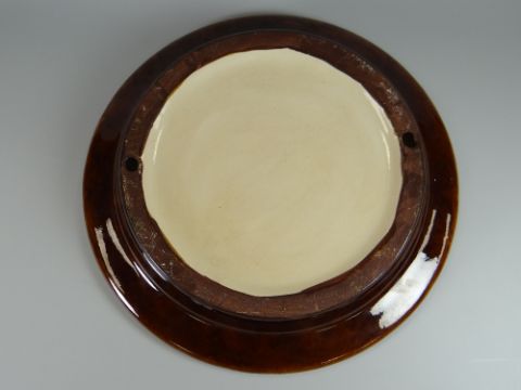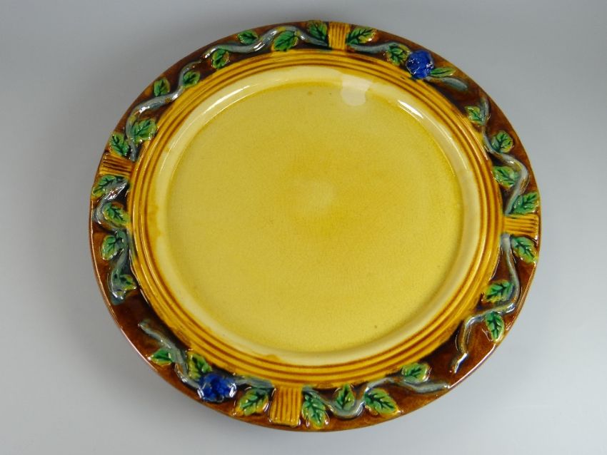 A MINTON MAJOLICA CHEESE DOME & STAND in the form of a beehive, with grapevines & having a loop handle, 37cms high