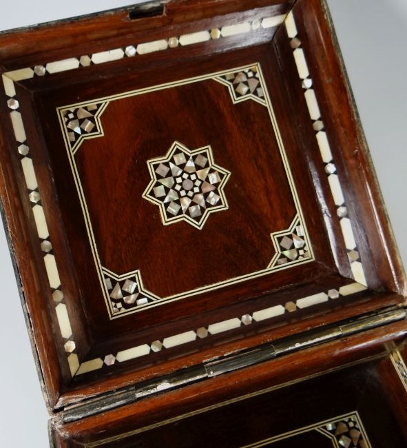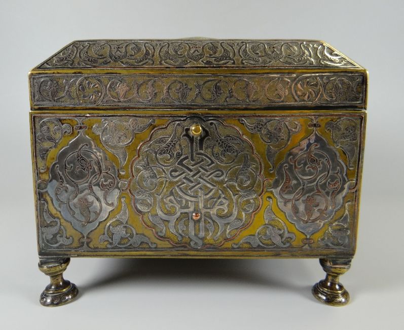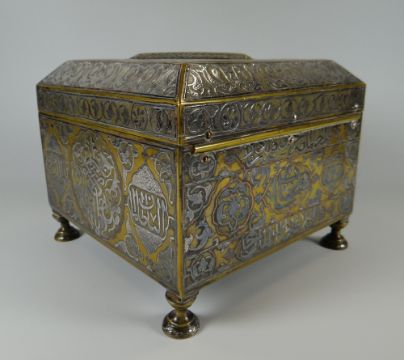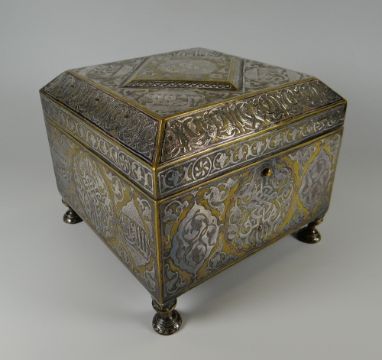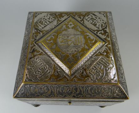 A GOOD ISLAMIC BELIEVED SILVER & YELLOW METAL OVERLAID CASKET profusely decorated with Arabic script, floral motifs & icons etc, raised on four feet, the interior of mother-of-pearl & marquetry form, 19 x 19 x 17cms high