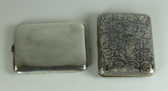 TWO SILVER CIGARETTE CASES one being Birks Sterling with engraved attribution, dated 1924 the other being European with Niello type decoration, 7.5ozs