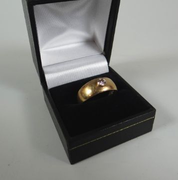 A 9CT YELLOW GOLD & DIAMOND BAND RING, with single raised round-cut diamond, 5.8gms