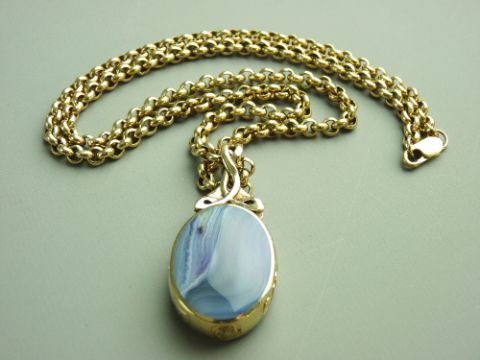 A NINE CARAT GOLD AGATE & BLUE GOLDSTONE OVAL PENDANT in an attractive mount and having a 60cms belcher chain, 66gms gross
